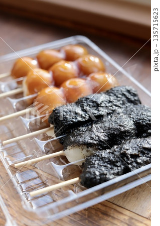 プラスチックケースに入れてある串団子 みたらし団子と胡麻団子
