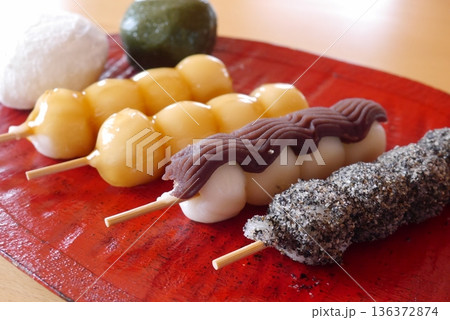 木製プレートに並べた三色団子と黒ごま団子の和菓子写真。日本の伝統的な串団子を並べた甘味のイメージ素材