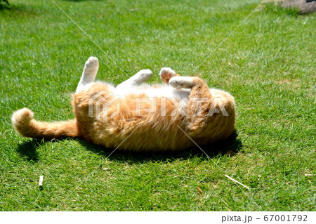 芝生でごろにゃん甘えん坊、茶トラ白ソックス猫。地域猫