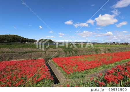 愛知県半田市岩滑西町 ごんぎつねゆかりのごんの秋まつり 矢勝川堤の彼岸花(曼珠沙華)群生と青空