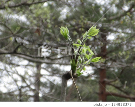 春の光を浴びるコシアブラの新芽