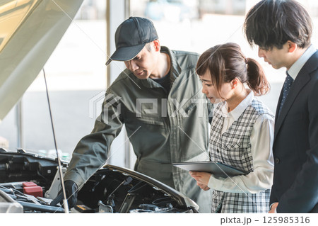 車のエンジンルームで女性客に説明,解説をする整備士,メカニックの男性スタッフ