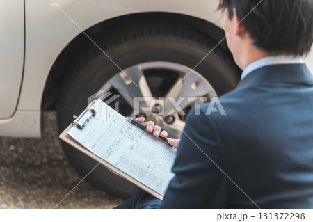 チェック表を使って車の査定・見積もりをするセールスマン・査定士男性スタッフ