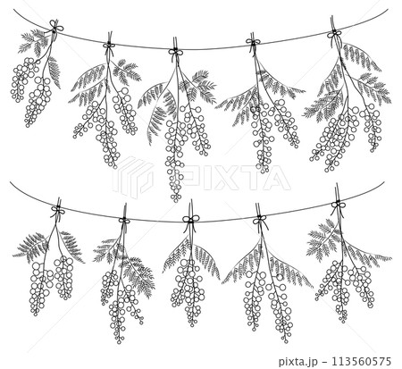ひもに吊るされたミモザの花のガーランド【白黒・線画】