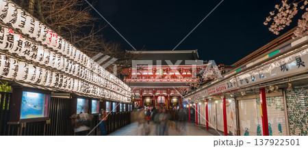 「東京都」浅草寺の仲見世通りと満開の桜・台東区 夜景
