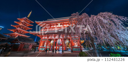 「東京都」浅草寺の宝蔵門と満開の枝垂れ桜・台東区 夜景
