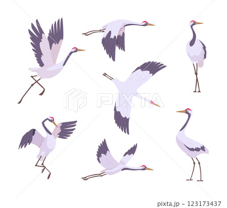 Crane birds. Wildlife flying beauty stork in action elegant poses exact vector cartoon collection
