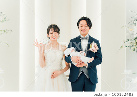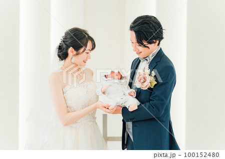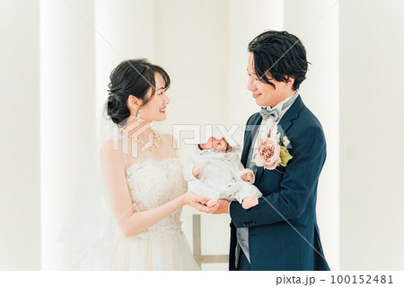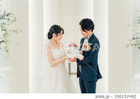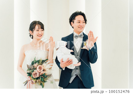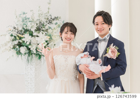 結婚式場で赤ちゃんと一緒に結婚式をあげる新郎新婦(授かり婚・おめでた婚・パパママ婚)