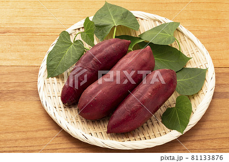 ざるに乗せたさつまいもとサツマイモ