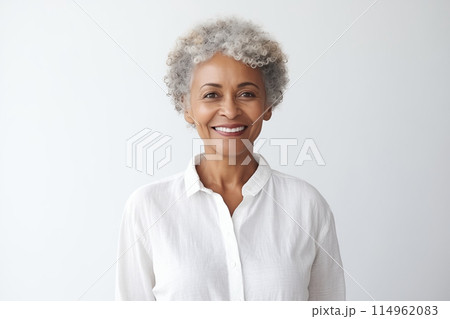 Portrait of beautiful happy smiling african mature woman with gray hair on white studio background