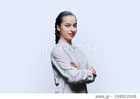 Portrait of teenage girl with crossed arms on white background