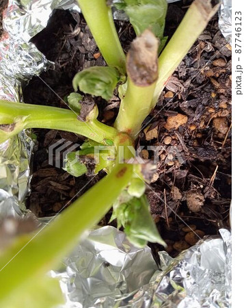 ソラマメの株元にいるアブラムシが集まり始めたところ