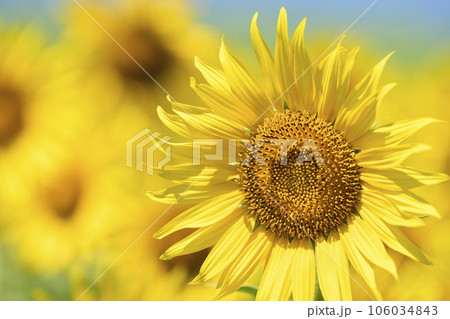 家の周りの草花 四季の色々 農園の花畑に美しい大輪のヒマワリの花が青空に向かって咲いています