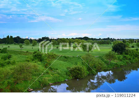 緑濃い初夏のゴルフ場 池 バンカー 人無しグリーン