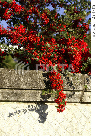 Pyracantha coccinea berries. Rosaceae family. Firethorn bush. Beautiful autumn garden.