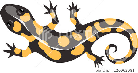 Colorful illustration of a fire salamander lying down, showcasing its vibrant yellow spots or stripes on a black background, highlighting the amphibian s unique pattern