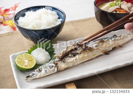 日本食 秋の食卓 さんま塩焼き お味噌汁 さんま サンマ 焼き魚 秋刀魚 日本料理