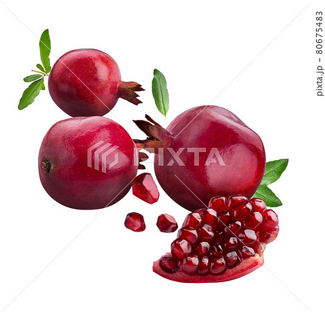 Collection of pomegranates isolated. Fresh ripe pomegranate, half of pomegranate and cut in a slice of pomegranate with clipping path.