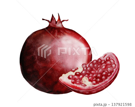 Pomegranate fruit half watercolor. Realistic botanical illustration on a white background. Perfect for packaging design, organic cosmetics, invitations, and wellness branding. Handmade.