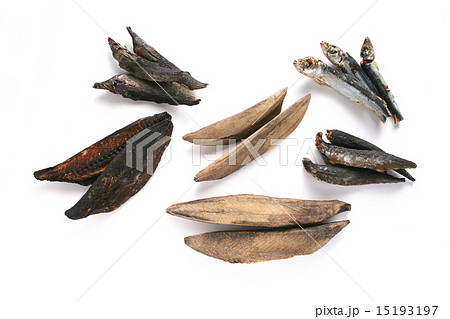 魚介出汁と出汁パックの材料を載せた木皿のイラスト