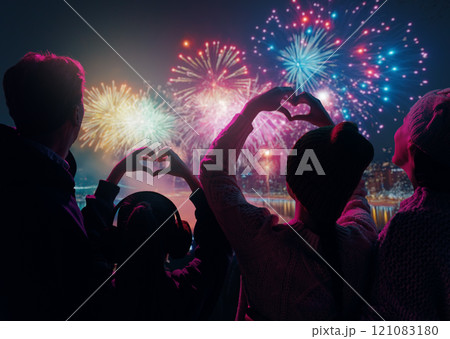 Woman in Winter Clothing with Vibrant Fireworks in the Background for New Year Celebration with Generative AI.