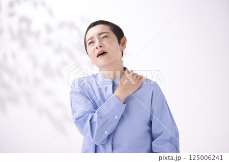 40代女性白バック、喉が痛い、息が苦しい、ポーズ