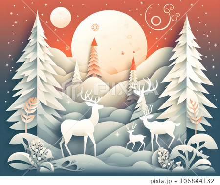 Landscape with dark winter northern forest and wild deer portrait, vector illustration. Wild animals of the north. Realistic vector landscape. natural background