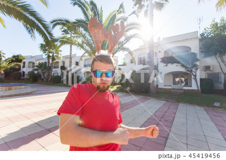 Holidays and people concept - funny man in christmas deer horns dancing outdoors