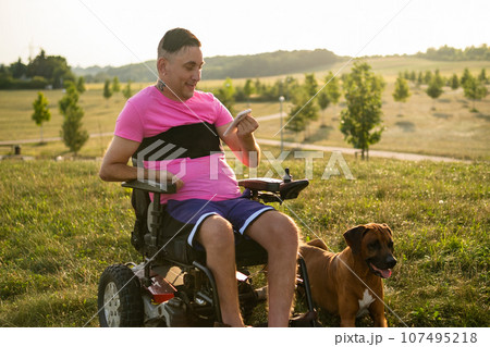 A young LGBT person with a disability uses a tablet while enjoying time with his dog at the park from a wheelchair at sunset