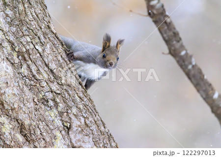 雪の中で立ち止まるエゾリス