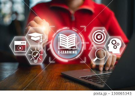E-learning education, internet lessons and online webinar. Technology course, teaching, business training. e-learning, online education, education, internet learning. Education internet technology.