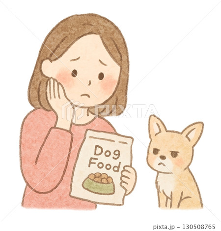 ドッグフードを嫌がるチワワと困った飼い主のイラスト