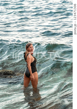 Woman Swimsuit Ocean Water - Woman in a black swimsuit wading in the ocean water.