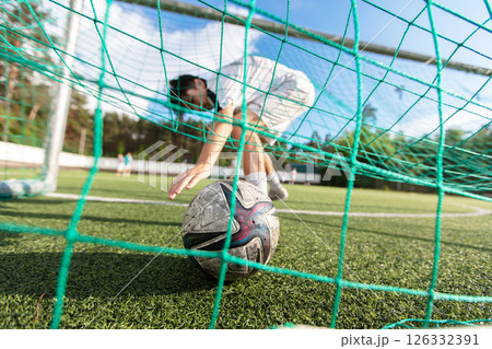 A soccer ball lies in a net on a field. Football is a sport. The concept of scoring a goal.