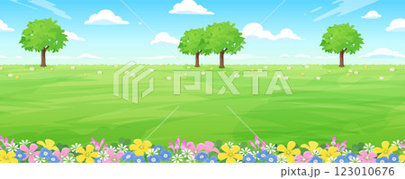 春の花が咲いた芝生の公園の風景イラスト_16:9