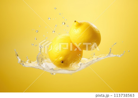 Fresh juicy lemon in splashes of water on a yellow background