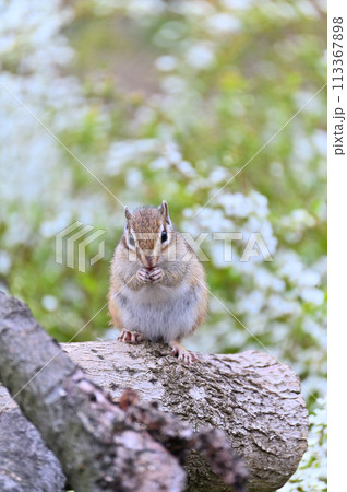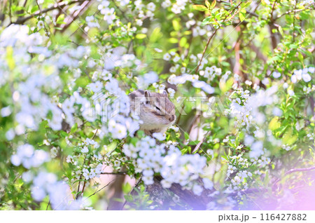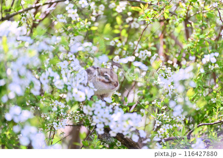 ユキヤナギとシマリス 埼玉県さいたま市(市民の森・見沼グリーンセンター・りすの家)春素材
