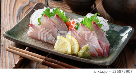 日本の寿司。新鮮なお刺身のシマアジ握り寿司。