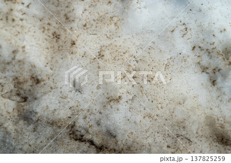 Dirty spring snow with gritty debris, closeup of melting ice stained by roadside dust and tiny sand granules, cool gray tones, wet crystalline surface, tactile atmosphere