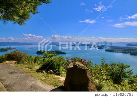 岡山県倉敷市の鷲羽山の鍾秀峰(山頂展望台)から南西側の眺望(下津井瀬戸大橋,櫃石島橋など)