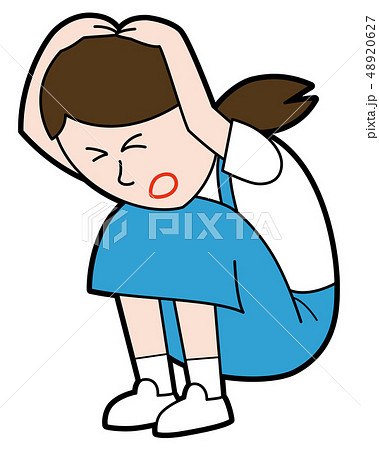 しゃがみこみ 腕で頭部を守る少女 白背景