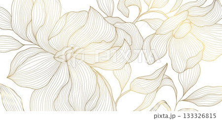 Luxury floral vector background, golden peony outlines, botanical leaves, elegant line patterns, Japanese, Chinese art. Wedding invitation, spring card, oriental wallpaper, decorative template.