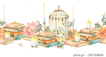 Vintage floral seamless border with old stack of book, candle, gold birdcage and flowers. Aesthetic elegant retro watercolor illustration isolated from background. Cozy still life for your design