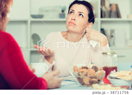 Portrait of sad female talking with mother at table