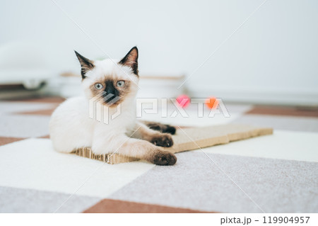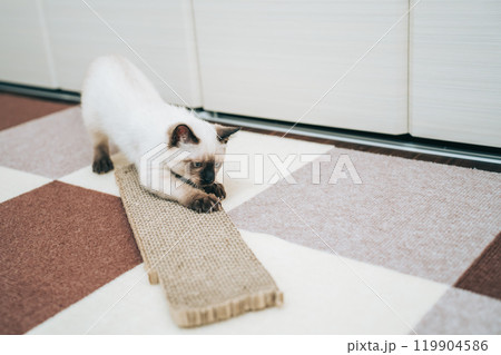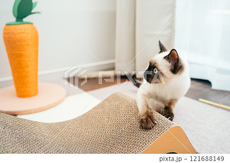 爪研ぎをするシャム猫ミックスの子猫