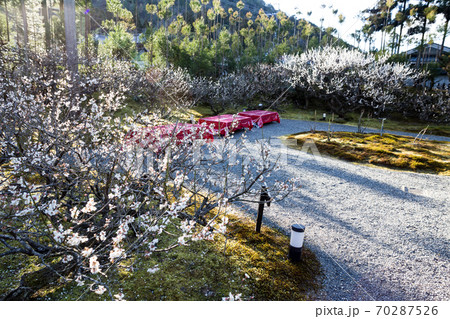 京都の梅の名所「しょうざんリゾート」日本庭園、紅白梅が満開の梅園