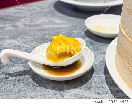 蒸篭料理。肉汁がたっぷりのおいしい小籠包。レンゲスプーンに乗せた黄色い小籠包。