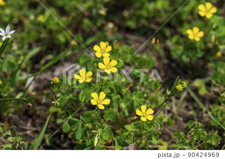 黄色い花、五弁の黄色い花、カタバミの黄色い花