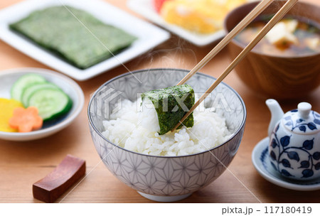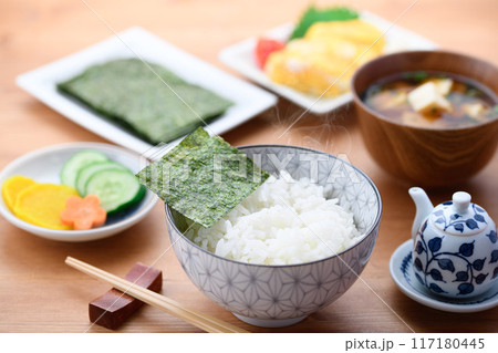 日本の朝食 海苔 味噌味 お漬物 玉子焼き