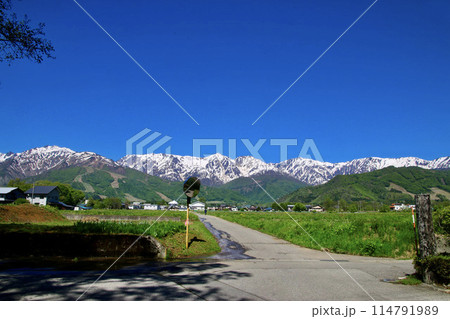 春の白馬岳と代かき馬の雪形 長野県白馬村